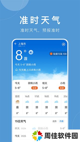 准时天气软件将带给用户最棒的服务,在这个软件里用户可以快速的查询到当天天气,没有收费的项目,可以查询到未来十五天的天气情况,可以详细的了解信息,还会实时进行检测,使用起来很是不错,感兴趣的用户可以下载试一试。