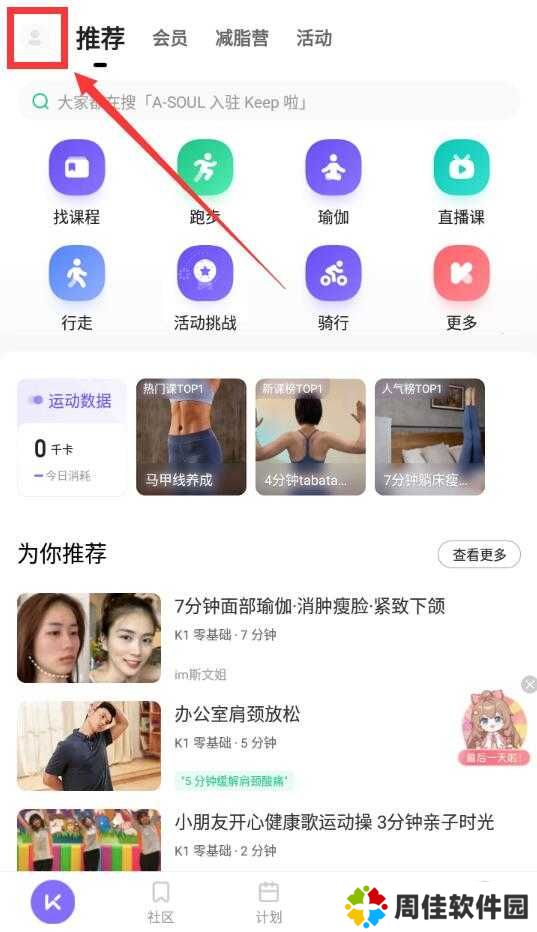 1、打开keep,在首页左上角点击“头像”图标