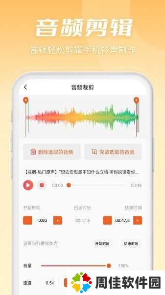 精确到毫秒的专业剪辑;从本地音乐库导入音频,自定义剪切范围,对裁剪的音频进行编辑和制作。