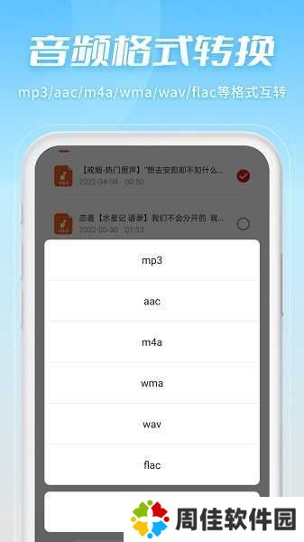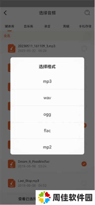 支持音频格式:mp3、aac、m4a、wav、flac、ogg、mp2、m4r、ac3、amr