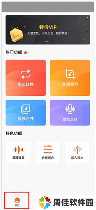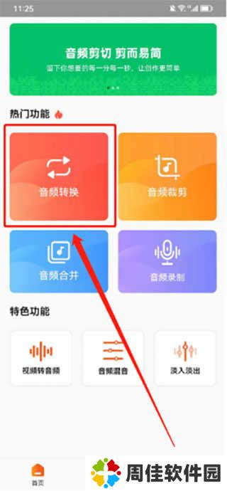1、从本站下载金舟音频剪辑转换App,安装后直接进入应用即可。软件支持格式转换、音频剪辑、音频合并、音频录制等基础功能,同时还提供音频提取、音频混音、淡入淡出等特色功能,满足您手机音频转换的功能需求。