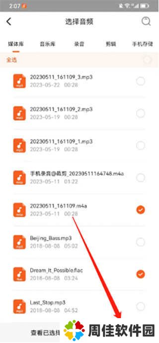 3、勾选需要转换格式的音频文件,可从媒体库、音乐库、录音、剪辑、手机存储四个位置进行选择,然后点击“下一步”。