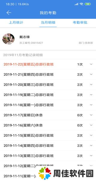 3、多样化的考勤数据记录,包括上月、当月、上周和其他时间段的考勤数据信息。