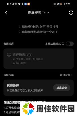 点击投屏按钮后,会出现如下图的界面(我的电视机未打开,所以电视机显示断网状态。):