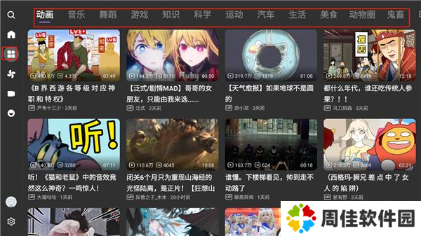5、点击分类按钮,里面提供了动画、音乐、舞蹈、游戏、知识、科学等等不同类型的小视频;