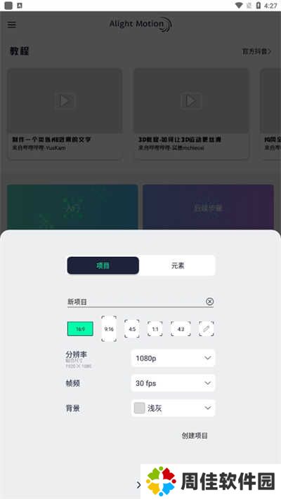 2、可以设置项目名称、宽高比例、分辨率、帧速率、背景颜色;