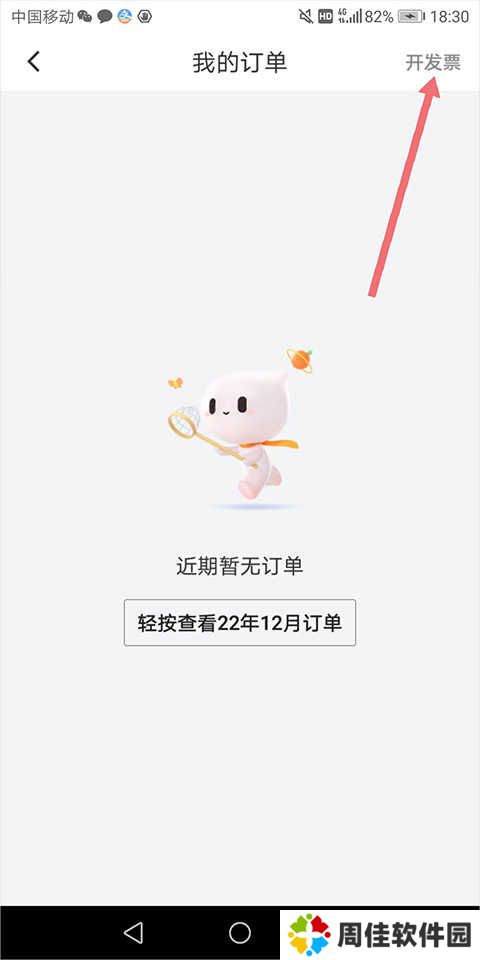 2、在打开的【我的订单】页面中点击右上角的【开发票】(下图红色箭头所指)