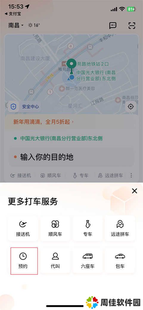 1、在本站下载并打开滴滴出行app苹果版,登录我们的账号后回到首页,点击下图位置的预约选项