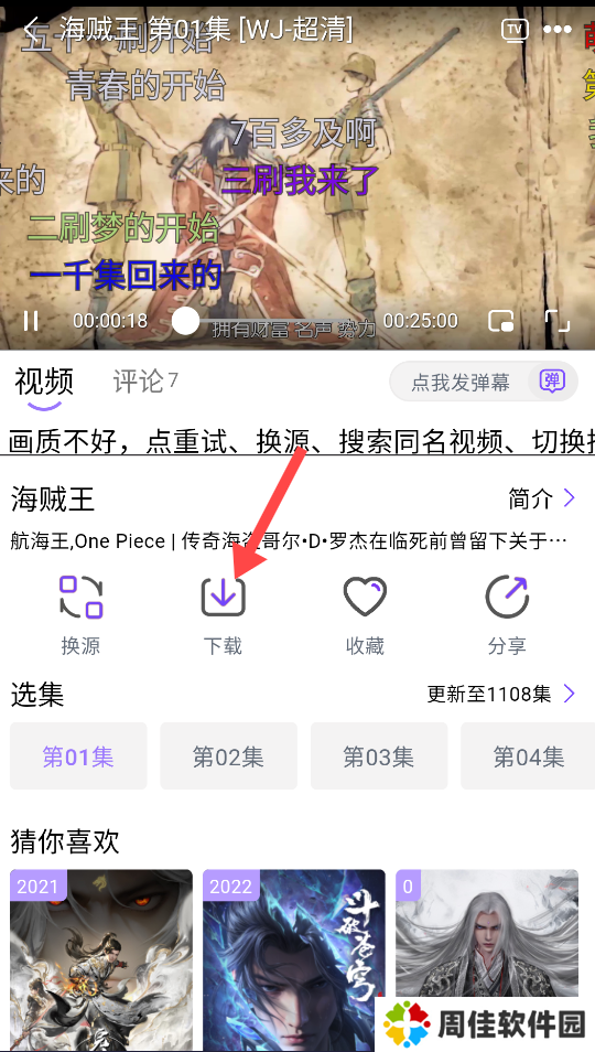 1、还是以海贼王为例,进入动漫播放界面后,点击中间如图所示的下载按钮