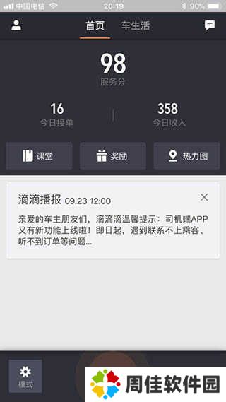 2、系统会帮你听单,其实就是在筛选合适的给你派单,这时候你可以看到你今天出单情况,收入情况,你的服务分有多少,还能看一些系统消息。