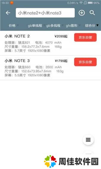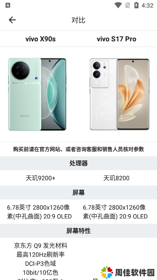 5、接下来,app将展示这两款手机在处理器、屏幕、屏幕特性等方面的详细比较结果。