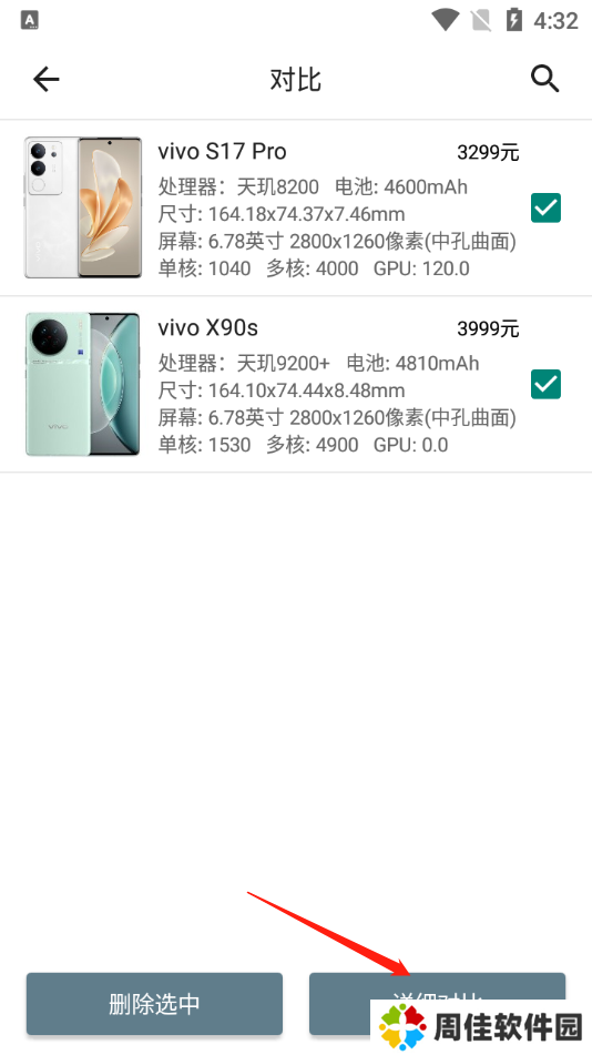 4、若要进行性能对比,用户需先选择两款手机加入对比列表,然后点击“进入对比”,选择这两款手机后,点击底部的“详细对比”按钮。