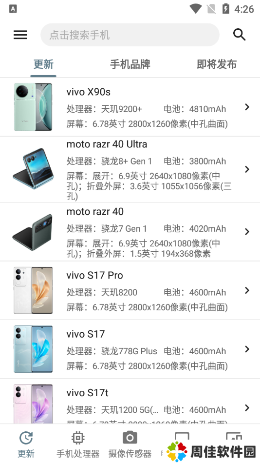 2、在更新页面,用户可以随意点击查看某款手机的详细信息;向下滑动,可以查看该手机的外观特性、电池续航、摄影录像等多项参数。