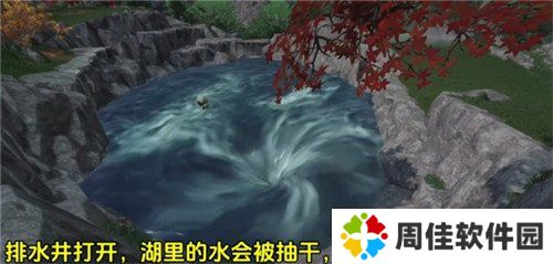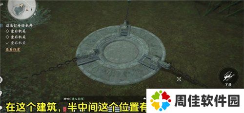 在任务中,你需要顺着铁链的指示去解锁对应的机关。铁链的位置并不难找,但需要仔细观察。在建筑的中央位置,你会看到有开关,确保在三个机关处都进行了操作。解锁排水井后,湖中的水会被完全抽干,NPC才能进入下一阶段。