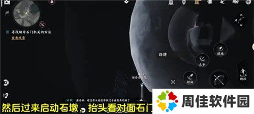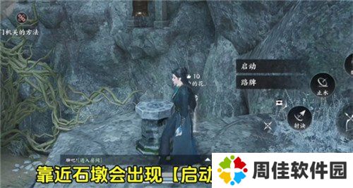 在水底探索结束后,你将到达一个石门前的区域。此时,你需要启动一个石墩。靠近石墩时,你会看到【启动】的提示。启动时要小心附近的蓝色花朵,这些花朵会导致你视线模糊,可能会让你错过一些细节。